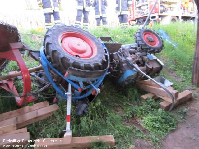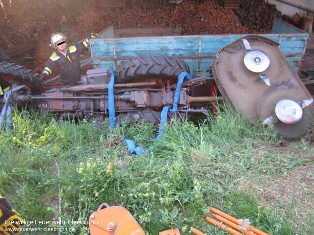 Ein 75 Jähriger Cleebronner Weingärter ist am Mittwochabend im Gewann "Roth" in Cleebronn tödlich verunglückt. Beim Mähen des Grünstreifens entlang eines asphaltierten Weinbergweges rutschte der Schmalspurtraktor die angrenzende Böschung hinunter und kippte um. Dabei stürzte das Fahrzeug gegen einen am Fusse der Böschung abgestellten landwirtschaftlichen Anhänger. Der Fahrer wurde zwischen Traktor und Anhänger eingeklemmt, er erlag noch an der Unfallstelle seinen schweren Verletzungen. Die Feuerwehren aus Cleebronn und Güglingen waren mit 42 Einsatzkräften und 7 Fahrzeugen im Einsatz. Neben Rettungsdienst und Polizei waren drei Notfallseelsorger am Unglücksort, um die an der Unfallstelle anwesenden Angehörigen des Verunglückten zu betreuen. Die Bergungsmassnahmen dauerten bis ca. 21:45 Uhr an.